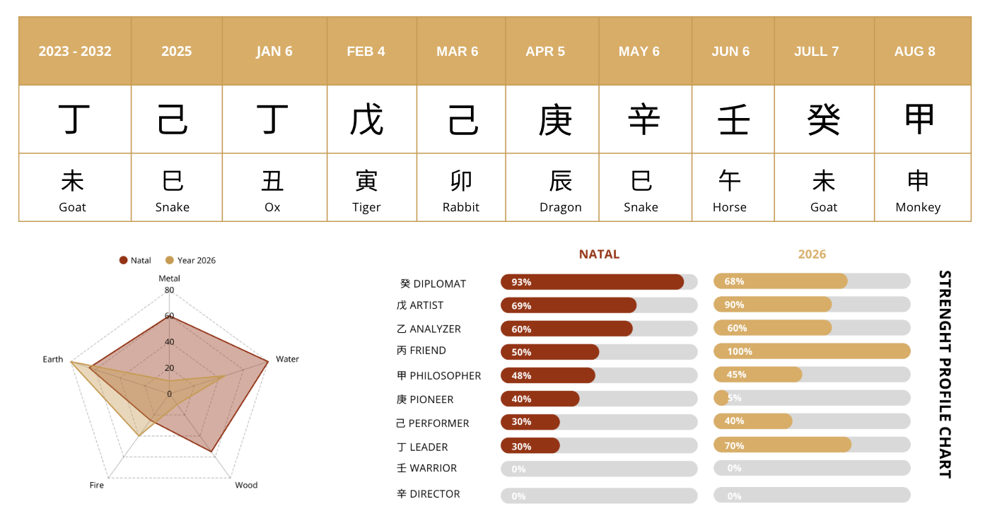 The calendar, developed through Feng Shui and BaZi astrology analysis, includes: